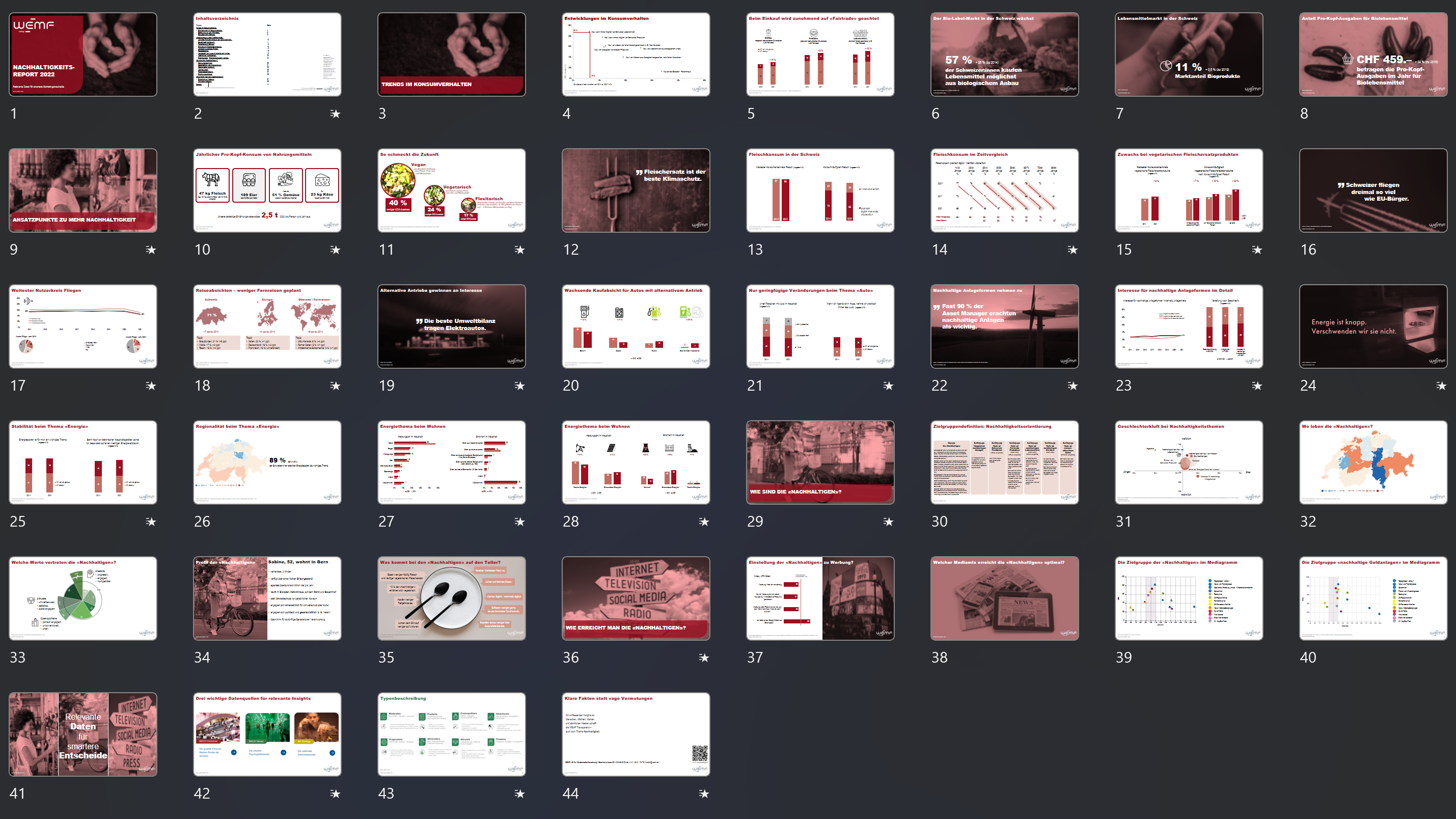 Ce rapport détaillé sur le développement durable apporte un éclairage sur les attitudes ainsi que les comportements d’information et de consommation de la population suisse, l’ensemble dans une optique de développement durable. Une attention toute particulière revient aux tendances concernant l’achat et la consommation de produits alimentaires ainsi qu’aux comportements en matière de voyages. Critères sociodémographiques et graphiques rendent identifiable le groupe des «durabilistes». Le rapport sur le développement durable repose sur la plus grande étude consommation-médias de Suisse et est ainsi représentatif de toutes les parties du pays.